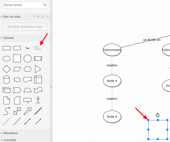 Escoge la figura que más te interese de la columna de la izquierda y arrástrala hasta el sitio donde quieras que esté el nodo. Luego podrás escribir el texto haciendo clic sobre la figura que has soltado: