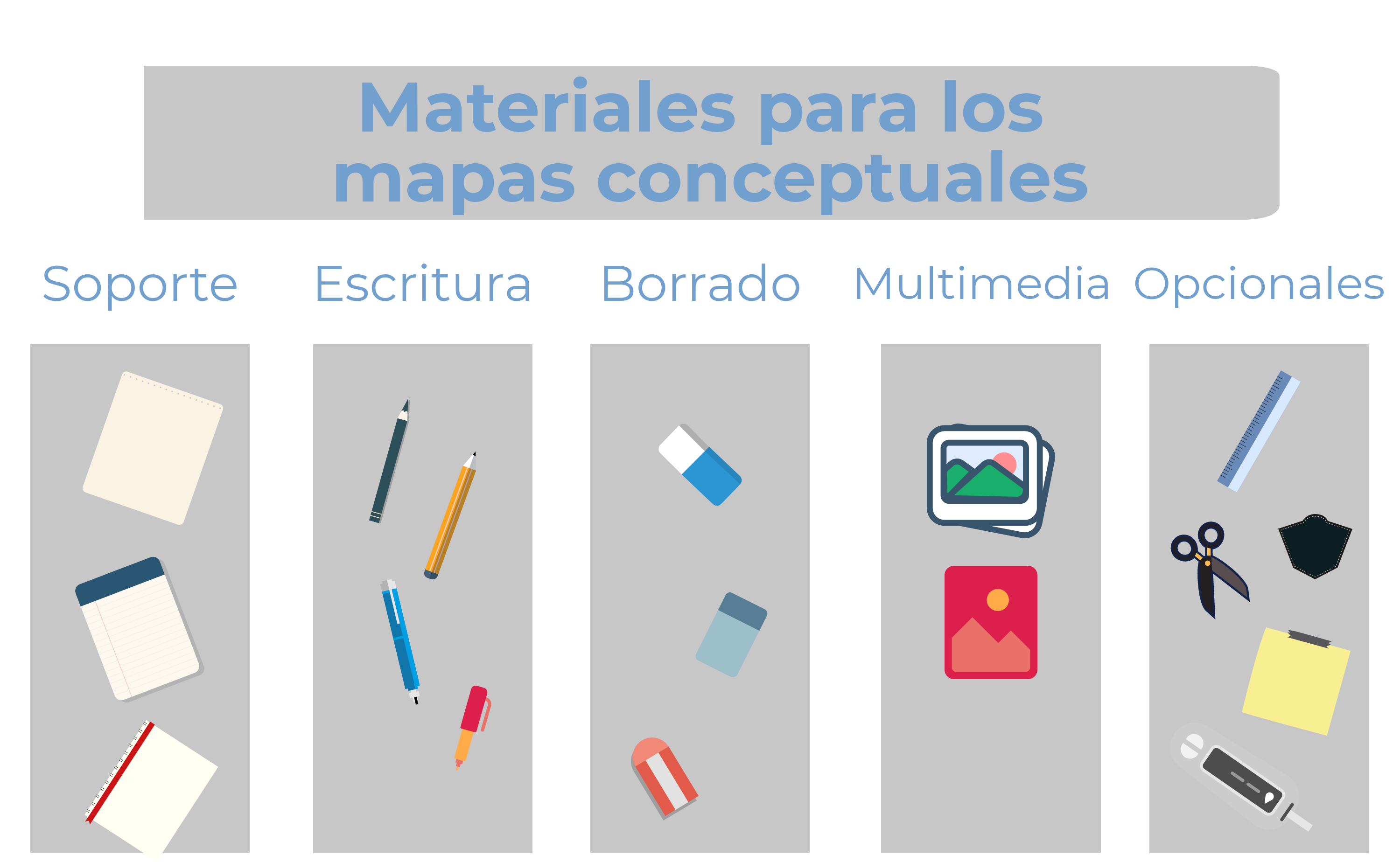 Los materiales que usarás para este tipo de mapas conceptuales, que podrán ser de cualquiera de los tipos vistos en el apartado 3 de la unidad (exceptuando hipermediales), serán de uso común y bajo coste. Puedes verlo en esta infografía: