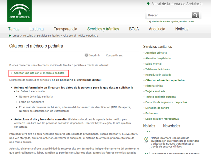 Accediendo al siguiente enlace http://www.juntadeandalucia.es/temas/salud/servicios/cita.html de la Junta de Andalucía llegaremos al apartado de “Cita con el médico o pediatra”.